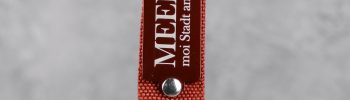 Schlüsselanhänger mit Metallplatte und Gravur „Meenz moi Stadt am Rhoi“